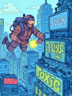 A courier with a jetpack emblazoned with graffiti art soars between skyscrapers, delivering a glowing package. The background features competing corporate logos in neon red and toxic green.