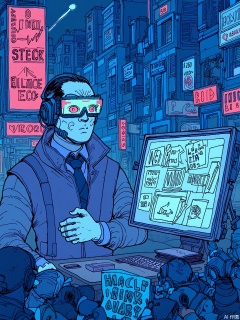 A news anchor with holographic makeup delivers a broadcast from a set dominated by flickering stock tickers in neon red and white, while protestors march outside with glowing placards.