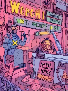 SBPK, A retro-futuristic street vendor sells glowing noodles from a cart adorned with flickering neon kanji, while a drone hovers overhead projecting augmented reality menus in holographic pink and gold.