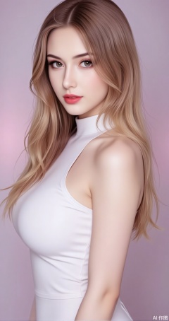 lvjing,baoshi,meinv,large breasts,long hair,brown hair,blonde hair,brown eyes,lips,red lips,turtleneck,1girl,breasts,solo,dress,long hair,white dress,large breasts,sideboob,brown hair,sleeveless,bare shoulders,from side,sleeveless dress,standing,bare arms,8,cover,gradient background,close-up details,outstanding style,adding a touch of dimension to your images without compromising details,close-up,