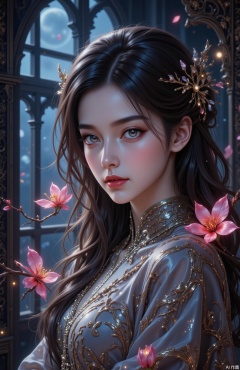 Candlewick crackles, casting lash shadows like fine lattice on silk. Tarnished mirror reflects half-face framed in thirds composition. Fresh ink plum blossoms bleed ultramarine at upper left. Moonlight fractures through first-person window grids as paper fragments float down - creased with ink trails, alighting on pomegranate sleeves like night butterflies..,surrealism,motion blur effect,jzbj