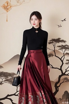 a person standing in front of a traditional Asian-style wallpaper that features a serene landscape with mountains, trees, and birds. The person is dressed in a sophisticated outfit consisting of a black long-sleeve top and a flowing, deep red skirt with intricate patterns. They are holding a small black handbag in their right hand. The background wallpaper adds a sense of tranquility and cultural richness, enhancing the overall aesthetic of the scene.