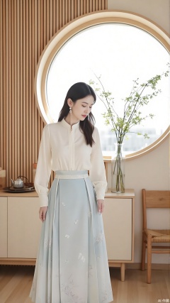 a person standing in a room with a serene and elegant atmosphere. The room features a large round window with wooden slats, allowing natural light to filter in. The person is dressed in a sophisticated outfit consisting of a cream-colored blouse with long sleeves and a light blue skirt adorned with delicate floral patterns. The room is decorated with minimalistic furniture, including a wooden chair and a low cabinet with a teapot and other items on top. A potted plant is also visible, adding a touch of greenery to the space. The overall ambiance of the room is calm and inviting, with a blend of traditional and modern elements.