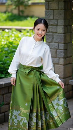 a person standing outdoors, dressed in a traditional outfit. The person is wearing a white blouse with long sleeves and a green skirt adorned with white floral and golden patterns. The background features lush greenery and a stone structure, suggesting a serene, natural setting. The person is holding the edge of the skirt with one hand, and their hair is neatly tied back.