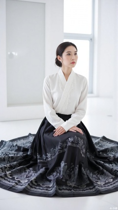 a person sitting on the floor, wearing a traditional outfit that includes a white blouse and a black skirt with intricate patterns. The person is positioned in a way that their hands are resting on their knees, and they are looking up slightly. The background appears to be a modern, minimalistic room with white walls and a large window. The overall setting gives a sense of elegance and cultural heritage.