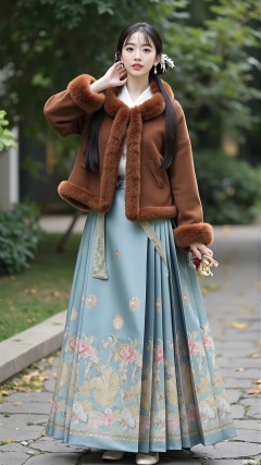 a person dressed in traditional attire, standing outdoors. The outfit features a long, flowing skirt with intricate floral embroidery and a fur-trimmed coat. The person is posing with one hand touching their face and the other holding a decorative item. The background includes greenery and a stone pathway, suggesting a serene, garden-like setting. The overall aesthetic is elegant and traditional, with a focus on detailed craftsmanship in both the clothing and accessories.