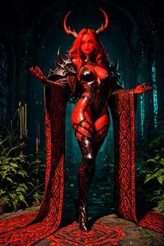 (masterpiece, best quality, high resolution, absurdres, newest,very aesthetic, amazing quality,impressionism style,Fabulous artwork,Volumetric image,),Dark fantasy demoness with white and red hair,red skin and horns,Wearing red and black armor with intricate patterns,detailed character design,dramatic lighting and intense expression,full body shot,