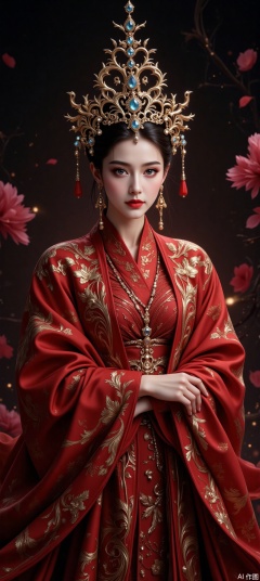 The image depicts a woman dressed in an elaborate traditional outfit, likely inspired by East Asian fashion. She is wearing a richly embroidered red robe with gold patterns, which is complemented by a matching red dress underneath. Her headdress is ornate, featuring intricate gold designs and blue gemstones, adding to her regal appearance. The background is dark with subtle, glowing particles and floral elements, creating a mystical and elegant atmosphere. The woman's makeup is striking, with bold red lipstick and detailed eye makeup, enhancing her overall regal look.