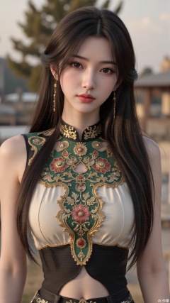 a asian woman, sexy long hair, blue eyes, charming and seductive temperament, distant close-up, golden ratio, movie texture, minimalism, high-end feeling, strong contrast between cold and warm, outdoor scenes,
