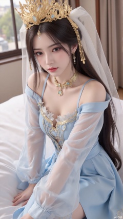 1girl, solo, jewelry, earrings, breasts, necklace, dress, realistic, bare shoulders, looking at viewer, lying, perfect body, scenery, sharp focus, best quality, masterpiece, detailed outfit, illustration, perfect eyes, finely detailed beautiful anime eyes, realistic skin, intricate details, best lighting, depth of field, ultra high resolution, bed, from above
