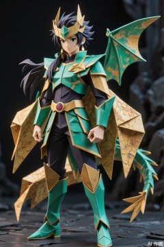 Liquid metal sacred clothing, Saint Seiya, long black hair, dragon helmet, dragon sacred clothing, green main color of armor, paired with golden texture, metallic green dragon wings behind, paired with golden texture, noble and gorgeous, small round shield on the wrist of the right hand, covers noble and gorgeous, and the background of the Dragon God is in a dark black tone.