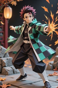 The image depicts a character in a dynamic pose, seemingly in the midst of an action. The character is wearing a green and black checkered cloak and a dark outfit with white trim. The character's hair is spiky and colored in shades of pink and purple. The background features a traditional setting with a lantern emitting a warm light, and there are autumn leaves scattered on the ground. The character's right arm is extended forward, and there are orange shards of energy or flames flying around their hand. The overall scene has a dramatic and action-packed feel.