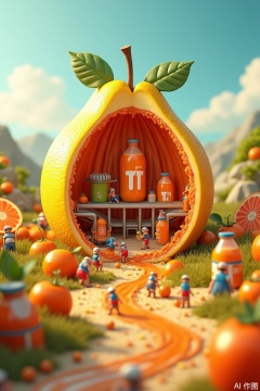 Vibrant miniature landscape with a gigantic fruit, halved to reveal a tiny 'TT' branded factory within. Inside, workers in 3D cartoon-style attire busily manufacture juice on an endless production line. Glass bottles flow continuously out of the factory, as far as the eye can see, amidst a world of bright colors, rich textures, and super-detailed rendering.