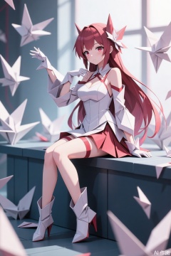 The image depicts a stylized anime-style character sitting on a dark blue block. The character has long red hair and is wearing a white and red outfit that includes a dress, gloves, and high-heeled boots. The character is surrounded by origami cranes, which are scattered around and floating in the air. The background is softly lit, with a large window allowing natural light to filter in, creating a serene and artistic atmosphere.