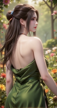 moist skin a woman standing in a lush, vibrant garden filled with an array of colorful flowers She is wrapped in a green towel, and her hair is tied back in a ponytail The garden appears to be bathed in soft, natural light, creating a serene and magical atmosphere The flowers are diverse in shape and color, adding to the whimsical and fantastical feel of the scene The woman seems to be in a state of relaxation or contemplation, surrounded by nature's beauty.