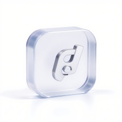 A minimalist PVC icon representing a magnifying glass, in a translucent clear color with a silver handle, against a white background. The icon has a glossy finish and a sharp, precise design.