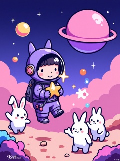 A round-cheeked girl in a purple spacesuit floats near a candy-colored asteroid, holding a glowing starfish. Three alien bunnies with antennae bounce beside her, trailing stardust. Simple geometric shapes with neon gradient skies.