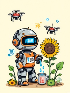 A tiny robot in a flowerpot helmet waters a mechanical sunflower, using oil-can droplets. A ladybug-shaped drone buzzes overhead, trailing vines. Retro-futuristic style with enamel pin details.