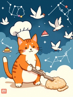 A ginger cat in a chef's hat kneads dough on a cloud, while a flock of pigeons wearing aprons bake cookie constellations. Whimsical food-sky fusion with chalk-drawn borders.