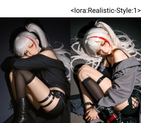 highres,absurdres,Visual impact,masterpiece,best quality,very aesthetic,amazing quality,newest,(realistic:1.3),(reality:1.3),(chiaroscuro:1.3),volumetric lighting,cinematic lighting,Natural Light,Mood Lighting,ray tracing,\,upper body, 1girl,solo, red eyes,white hair,long hair,(swept bangs),red streaked hair,side ponytail, open jacket,off-shoulder shirt,bare shoulder,long sleeves,shorts,chain,side slit,boots,buckle,single thighhigh,black thighigh, upper body,looking at viewer,(jitome:1.2),tsurime,light smile,smirk,(lying:1.3),on side,hugging own legs, simple background,drop shadow,
