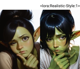 highres,absurdres,Visual impact,masterpiece,best quality,very aesthetic,amazing quality,newest,(realistic:1.3),(reality:1.3),(chiaroscuro:1.3),volumetric lighting,cinematic lighting,Natural Light,Mood Lighting,ray tracing,1girl,extremely delicate and beautiful,Noise and grain,huge filesize,hatching_(texture),foreshortening,glamor,mature_female,looking_at_viewer,sideways_glance,from_side,portrait,black hair,(green skin:1.1),goblin,elf ears,high ponytail,swept bangs,thinking,confused,frown,serious,white_background,Slightly_open_mouth,uneven_eyes,hand_on_own_chin,black eyes,head_down,