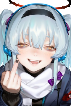 highres,absurdres,Visual impact,masterpiece,best quality,very aesthetic,amazing quality,newest,very awa,<lora:Face-Style:1>,(face focus:1.5),1girl,solo,hair between eyes,medium hair,twintails,light blue hair,long sidelocks,gradient eyes,yellow eyes,(orange eyes:0.8),bags under eyes,tareme,half closed eyes,short eyebrows,Black nails,(Black headband:1.1),(purple bow hair tie:1.1),1girl,solo,long hair,looking at viewer,blush,smile,open mouth,bangs,blue eyes,simple background,black hair,long sleeves,white background,hair between eyes,jacket,upper body,scarf,halo,blue jacket,armband,white scarf,blue headphones,black halo,thorns halo,middle finger,evil smile,evil grin,red crack halo,
