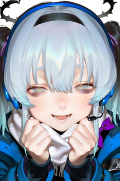 highres,absurdres,Visual impact,masterpiece,best quality,very aesthetic,amazing quality,newest,very awa,<lora:Face-Style:1>,(face focus:1.5),1girl,solo,hair between eyes,medium hair,twintails,light blue hair,long sidelocks,gradient eyes,yellow eyes,(orange eyes:0.8),bags under eyes,tareme,half closed eyes,short eyebrows,Black nails,(Black headband:1.1),(purple bow hair tie:1.1),1girl,solo,long hair,looking at viewer,blush,smile,open mouth,bangs,blue eyes,simple background,black hair,long sleeves,white background,hair between eyes,jacket,upper body,scarf,halo,blue jacket,armband,white scarf,blue headphones,gradient hair,gradient eyes,black halo,thorns halo,