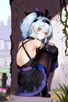 highres,absurdres,Visual impact,masterpiece,best quality,very aesthetic,amazing quality,very awa,newest,<lora:EkreaJan-Style-000050>,\\//,1girl,solo,hair between eyes,medium hair,twintails,light blue hair,long sidelocks,gradient eyes,yellow eyes,(orange eyes:0.8),bags under eyes,tareme,half closed eyes,short eyebrows,Black nails,(Black headband:1.1),(purple bow hair tie:1.1),bare shoulders,Purple lining,bow collar,black dress,(halter-neck dress:1.1),(Cross halter-neck dress:1.1),sleeveless dress,detached sleeves,long sleeves,puffy sleeves,wide sleeves,Black sleeves,(Bow armlet:1.8),(dark purple armlet:1.1),(dark purple belt:1.1),(purple belt:1.3),gradient pantyhose,black pantyhose,dark purple leg garters,fine fabric emphasis,high heels,\\//,1girl,solo,\,facing away,(facing back:1.5),tiptoes up,wall,(broken wall:1.3),(cityscape:1.1),(prison:1.1),paint can,paint splatter,grass,vines,looking back,smash wall,wall towards viewer,huge wall,sitting,fourth wall,hugging own legs,