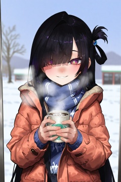 highres,absurdres,Visual impact,masterpiece,best quality,very aesthetic,amazing quality,very awa,newest,<lora:EkreaJan-Style-000050>,\\,1girl,solo,black hair,very long hair,long hair,asymmetric bangs,blunt bangs,diagonal bangs,hair over one eye,eyes visible through hair,single hair intake,single sidelock,single hair ring,red eyes,(gradient eyes:1.6),purple eyes,white pupils,(depth of field:1.3),(bokeh:0.5),(caustics:0.5),puffer jacket, knit beanieshy smile, rosy noseHanding hot drink, breath vaporConvenience store glow, snow outsideSteam rising from cupTwo-shot through glass door
