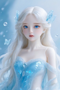 full body,standing,Frost Goddess,Frozen fluid,Ice World,ice,1girl,Translucent clothing,air bubble,blue butterfly,blue eyes,blue nails,breasts,Positive, character on the right, upper body, above knee level,Dynamic pose,bubble,Blue butterfly wings,butterfly wings,crystal,dress,glowing butterfly,long hair,looking at viewer,medium breasts,parted lips,solo,water,bjd
