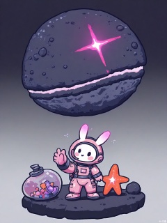 KACT, A round-cheeked girl in a purple spacesuit floats near a candy-colored asteroid, holding a glowing starfish. Three alien bunnies with antennae bounce beside her, trailing stardust. Simple geometric shapes with neon gradient skies.