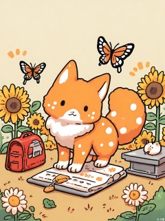 KACT, A fluffy orange kitten wearing a tiny red backpack wanders through a sunflower field, balancing a daisy chain on its head. Two butterflies with polka-dot wings follow closely, while a ladybug perches on a sunflower stem. Bold black outlines with watercolor splashes.