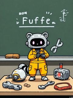 KACT, A raccoon in a striped mechanic's jumpsuit repairs a nut-and-bolt robot, wrench in paw. A firefly hovers with a tiny flashlight, illuminating the robot's gears. Industrial-chic background with chalkboard details.