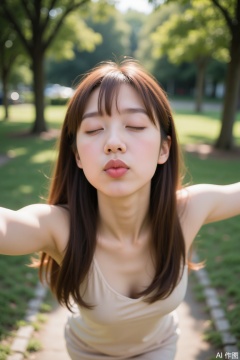 girl in a small park, She gazes off-camera with her eyes closed, puckered lips, and arms stretched out to both sides. Framed by lush greenery, the shot captures her intimate pose with a 105mm lens on D850 camera at F16 aperture, blending hard and soft light for a crisp and detailed image.