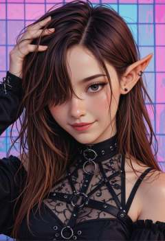 seductive, intimate, provocative, grunge, vaporwave, gothic, dark fantasy, asian, woman, detailed eyes, brown hair,upper body angle, edgy aesthetic, detailed,washed-out lipstick, hand on hair, stare, looking at viewer, hair behind ear, shy, smile, elf ears, small ears, hair over eye, veryn long asymmetrical bangs, messy hair,