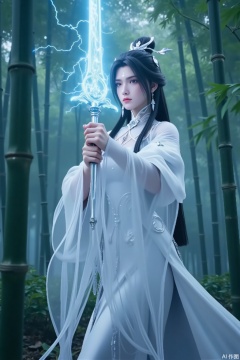 In the depths of a serene bamboo forest, a stunningly beautiful woman emerges as if stepping out of a painting, her presence seemingly freezing the air around her. A mysterious mark adorns her forehead, shining like the brightest star in the night sky, complementing her snow-white complexion. Her jet-black hair cascades like a waterfall, swaying gently in the breeze, intertwining with the bamboo leaves to create a mesmerizing scene. Her gray eyes are deep and clear, as if capable of perceiving all things in the world. She is clad in a white Han-style dress, its hem light and flowing, as soft as a cloud. The sleeves of her robe flutter, dancing in harmony with the bamboo leaves, as though she has become one with the forest. In her hand, she holds a gleaming sword, its blade entwined with dazzling lightning. With each flash of electricity, it seems as though the void itself could be torn apart. Where the sword points, a magical array slowly rotates in the air, emanating a mysterious and powerful energy. In the background, the bamboo forest is lush and verdant, its leaves fluttering in the air like countless dancing butterflies. The entire scene is dominated by a white palette, appearing pure and sacred. Her figure stands out vividly in this white world, like a celestial maiden descending to the mortal realm, carrying an aura of endless mystery and power.
