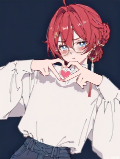 masterpiece,best quality, amazing quality,newest,absurdres,highres,very awa, danjin, danjin\(wuthering waves\), solo,1girl, upper_body, white shirt, long sleeves, braid buns, earrings, pout, red hair, heart_hands, standing, glasses, simple_background, dark blue pants,
