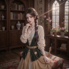 "In a circular library with neoclassical style, the background is visible with curved walnut bookshelves, and gold-plated ancient books and blue and white porcelain vases are scattered. The ground is covered with Persian geometric wool carpets, and the mist-covered Baroque courtyard can be seen through the arched windows.