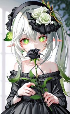 masterpiece,very aware,highres,absurdres,newest,best quality,loli,petite,high quality,chromatic_aberration,chromatic_aberration,cinematic_angle,dutch angle,//,[pottsness],[iumu],[Sheya],Artist taya oco,1girl,black flower,black rose,rose,nahida (genshin impact),solo,green eyes,flower,pointy ears,butterfly,side ponytail,holding,bug,black nails,dress,holding flower,white hair,looking at viewer,long hair,jewelry,hair ornament,alternate costume,hair between eyes,green hair,symbol-shaped pupils,frills,black dress,choker,hairband,green nails,nail polish,black choker,bare shoulders,upper body,collarbone,multicolored hair,off shoulder,earrings,off-shoulder dress,lolita fashion,covered mouth,white rose,green flower,gem,long sleeves,black headwear,cross-shaped pupils,//,//,<lora:MMD3——【noob】hans:0.8>,