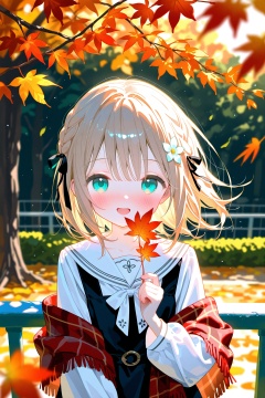 loli 1girl solo holding leaf holding ribbon looking at viewer shirt autumn leaves smile sleeveless dress hair ribbon maple leaf long sleeves open mouth white shirt braid sleeveless plaid dress outdoors pinafore dress leaf ribbon braid blurry plaid scarf hair ornament blonde hair black dress :d fringe trim autumn shawl depth of field flower collarbone blurry foreground green eyes upper body scarf blurry background black ribbon side braid branch day short hair aqua eyes hair flower blush medium hair white ribbon tree neckerchief railing holding flower white flower fence sailor collar floating hair light brown hair,