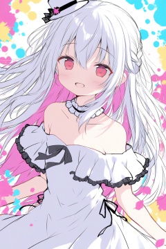 (illustration),(dynamic angle),(star background),(contrast colour),(paint), (1girl), loli, (white hair),(colorful highlight hair), red eyes, (detailed anime face), bare shoulder, white dress,(mini top hat),hair between eyes,braid,french braid,off-shoulder dress,frilled capelet, (colorful background),(surrounded by colorful splashes),colorful bubbles,(bright color),(floating),(rainbow color),color ink, ink splashing, (color splashing), open mouth, upper body, masterpiece, detailed, best quality, amazing quality, very aesthetic, absurdres, newest,