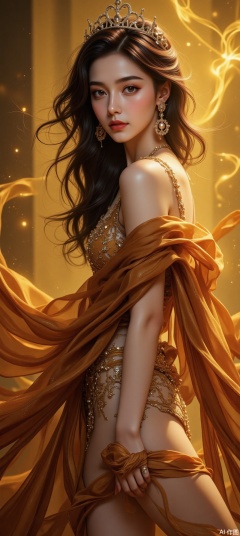 An elegant woman in a sheer lace gown and flesh-colored pantyhose, infused with a vintage oil painting style, surrounded by warm yellow soft-focus light. The soft materials of lace and pantyhose, combined with cinematic rendering, feature rich vintage brown and red tones. With the rule of thirds composition and a 45-degree side view, it showcases lazy and charming curves..,surrealism,digital-art,double-exposure