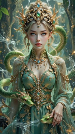 Masterful digital painting of a stunning woman, inspired by Giuseppe Castiglione's classic oriental style, combining fantasy and traditional Chinese aesthetics. The woman has alabaster white skin, strong facial features and rosy cheekbones, with well-defined pink lips. Her piercing green eyes are framed by straight, perfectly outlined eyebrows. She has flowing blonde hair with subtle greenish undertones. She wears an intricate golden headdress adorned with blue, green and red gemstones, paired with long golden earrings inlaid with white stones. Her outfit is a sheer green chiffon robe with a plunging neckline, complemented by a wide golden belt adorned with green and white gems. Her lower body seamlessly transforms into an elegant green snake, coiling beautifully as she floats in a turbulent river. The scene features a dreamlike background of swirling mist, sparkling water and lush textures. Cinematic lighting highlights her serene and calm expression, adding a surreal yet harmonious atmosphere. Predominantly green hues dominate the composition, accented with bright, rich details to enhance visual depth. The image combines detailed textures, intricate patterns, and a soft, ethereal glow for a visually captivating masterpiece. Hyperrealistic painting, Cinematic lighting, Oriental fantasy, Surreal harmony, Intricate details, Dreamlike atmosphere, High resolution (8k), Ethereal glow, Detailed textures, Vibrant color accents.,Sparkle Glowing,KiSS,Sparkle Glowing,BeautySnake_flx