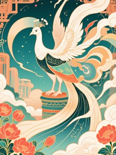 A phoenix-tailed peacock perches on a jade pedestal, its feathers transforming into burning incense trails. The scene is framed by arched moon gates filled with peony gardens.