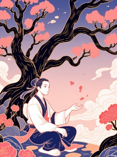 A scholar meditates beneath a gnarled pine tree, surrounded by floating ink brushes painting cherry blossoms. The sky transitions from twilight purple to dawn peach.