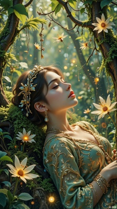 Reclining on velvet moss, her profile emerges from dappled forest light. Biomorphic shadows in viridian and amethyst cascade diagonally across the composition, echoing Art Nouveau motifs. Luminous pollen particles hover like suspended galaxies, their golden glow softened through gossamer diffusion filters. This 12K rendering preserves every impasto knife mark, transforming pixels into oil paint's tactile poetry..,surrealism,digital-art,double-exposure