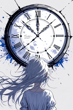 1girl, solo, long hair, from behind, roman numeral, clock, white hair, upper body, shirt, white shirt, facing away, floating hair, english text, white theme, grey background, dress, white background, character name, artist name, white dress, simple background, analog clock, short sleeves, ahoge, messy hair, signature, splatter, puffy sleeves, song name, grey hair, abstract background, back, paint splatter, broken glasst<lora:lp37-000040:0.7>