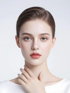 CMRX, A photograph of a young woman with fair skin and light brown hair styled in a sleek, low bun. She has a delicate, symmetrical face with well-defined eyebrows, blue eyes, and a subtle, natural makeup look. She is wearing a strapless white top that highlights her slender neck and shoulders. Her right hand is gently touching her chin, and she has a calm, serene expression. The background is a soft, gradient white, creating a clean and minimalist aesthetic. The lighting is soft and even, emphasizing her natural beauty. The overall style is elegant and sophisticated.