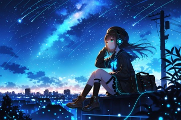 1girl, sky, solo, star (sky), night, starry sky, long hair, sitting, night sky, black socks, headphones, thigh strap, socks, outdoors, black hair, hat, blue eyes, bag, shooting star, beret, cloud, long sleeves, skirt, kneehighs, black footwear, boots, black headwear, cable, shoulder bag, closed mouth, looking afar, floating hair, black jacket, jacket, school bag, sleeves past wrists, tree, blunt bangs, blue theme, black skirt, black cardigan, school uniform, from side, wind, scenery, brown hair, light particles, city lights, blurry, hand on headphones, pleated skirt, knees up, building, skyline, cloudy sky, cardigan, cityscape, shoes, expressionless, sailor collar, meteor shower, dark, city, serafuku, hand up, power lines, nebula, sidelocks, holding, miniskirt, listening to music, backlighting, earphones, diffraction spikes, bridal garter, constellation, depth of field, thigh holster, ankle boots, black serafuku, frills, blue sky, shirt, black sailor collar, legwear garter, signature, duffel bag, milky way, full body, on roof, utility pole, plaid, glowing, sweater, plant, frilled skirt, dusk, leaf, looking ahead, evening, skyscraper, brown footwear, handbag, green eyes<lora:lp37-000040:0.7>