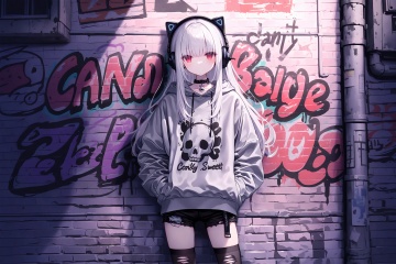 1girl, graffiti, solo, grey hoodie, long hair, red eyes, hood, torn clothes, looking at viewer, hoodie, thighhighs, hands in pockets, shorts, headphones, torn thighhighs, white hair, choker, black choker, black shorts, hood down, black thighhighs, short shorts, closed mouth, standing, long sleeves, cowboy shot, outdoors, torn shorts, sidelocks, animal ears, torn pants, drawstring, denim, skull print, against wall, expressionless, denim shorts, collar, brick wall, collarbone, english text, hair between eyes, straight-on, cutoffs, print hoodie, clothes writing, animal ear headphones, smile, albino, hooded sweater, alley, black collar, day, grey hair, fake animal ears, virtual youtuber, blunt bangs<lora:lp37-000040:0.9>
